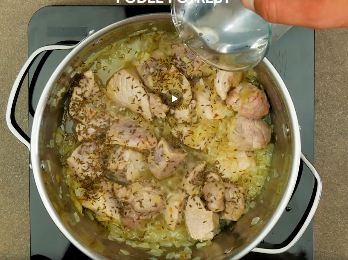 1. Potom přidáme sůl a kmín a necháme dusit do změknutí, postupně přidáváme dle potřeby vodu.